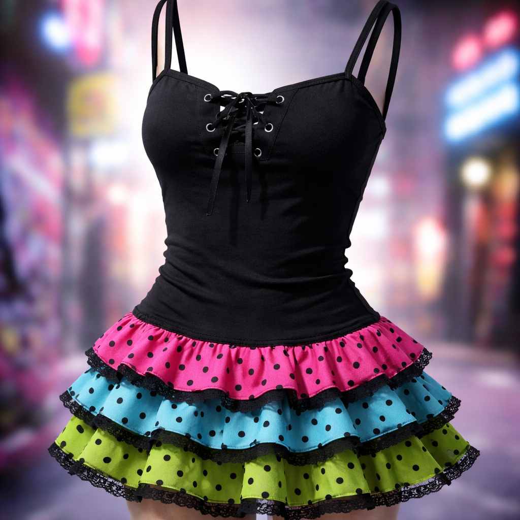 Japanese Street fashion design: Black cotton tank top, form-fitting, with tiered ruffle layers at the bottom. Layers are hot pink, aqua, and bright green cotton, all with black polka dots. Edgy, youthful Japanese street style.
