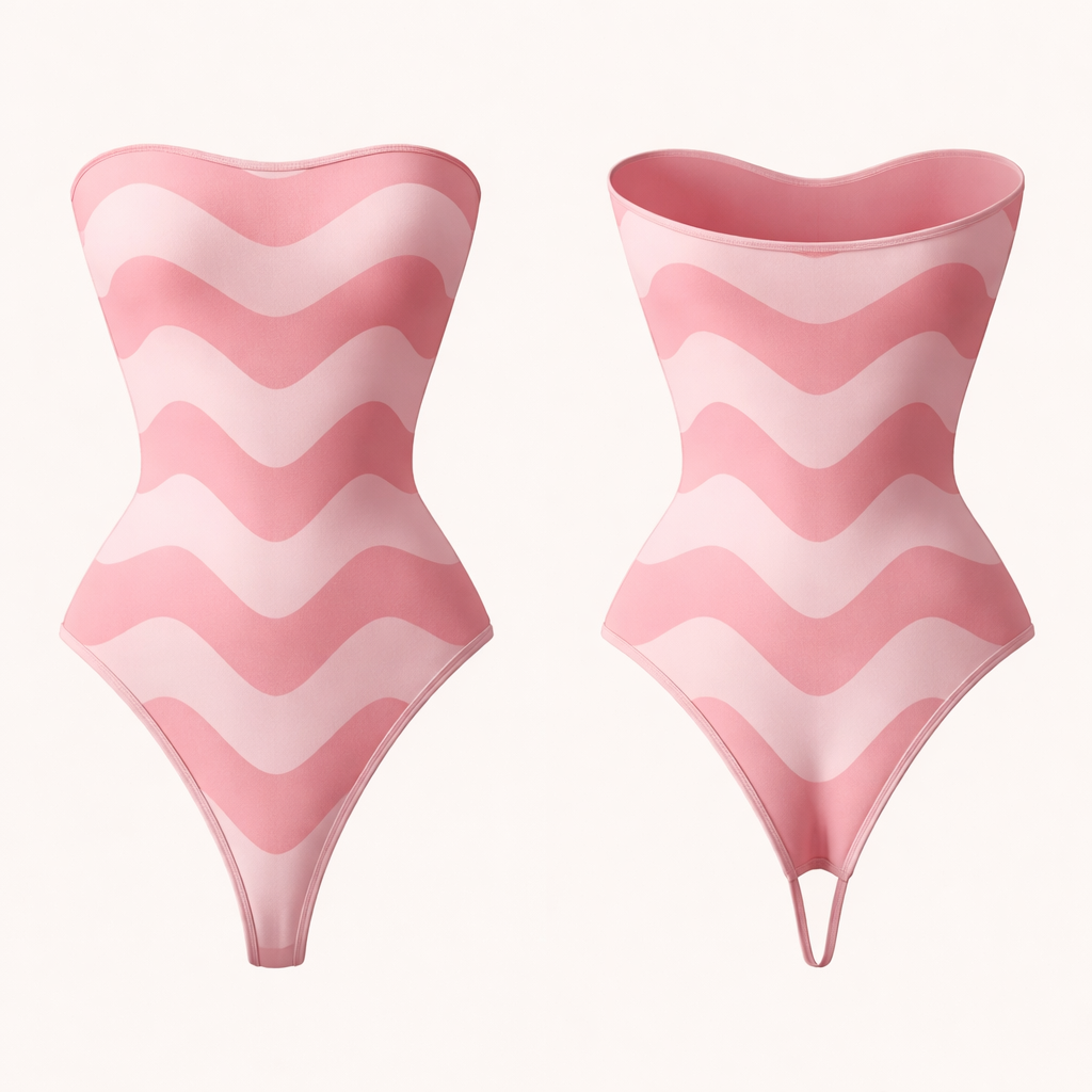 Bodysuit shape wear g string no ai model strapless no lines just no bow just string and no back open no ruffles ric rac pink and light pink stripes zig zag