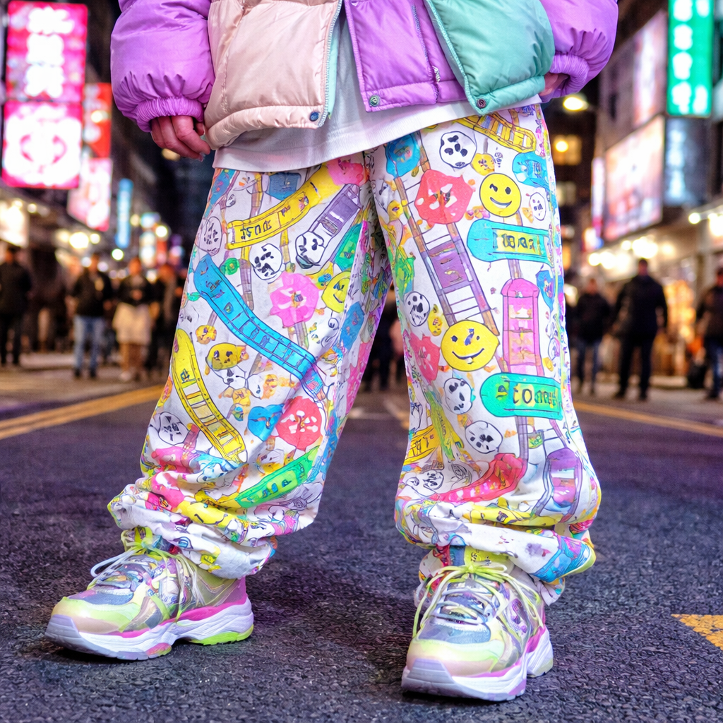 Japanese Street fashion design: Neon color snowboard pants, baggy fit, cotton, with a playful board game print, layered under an oversized puffer jacket.