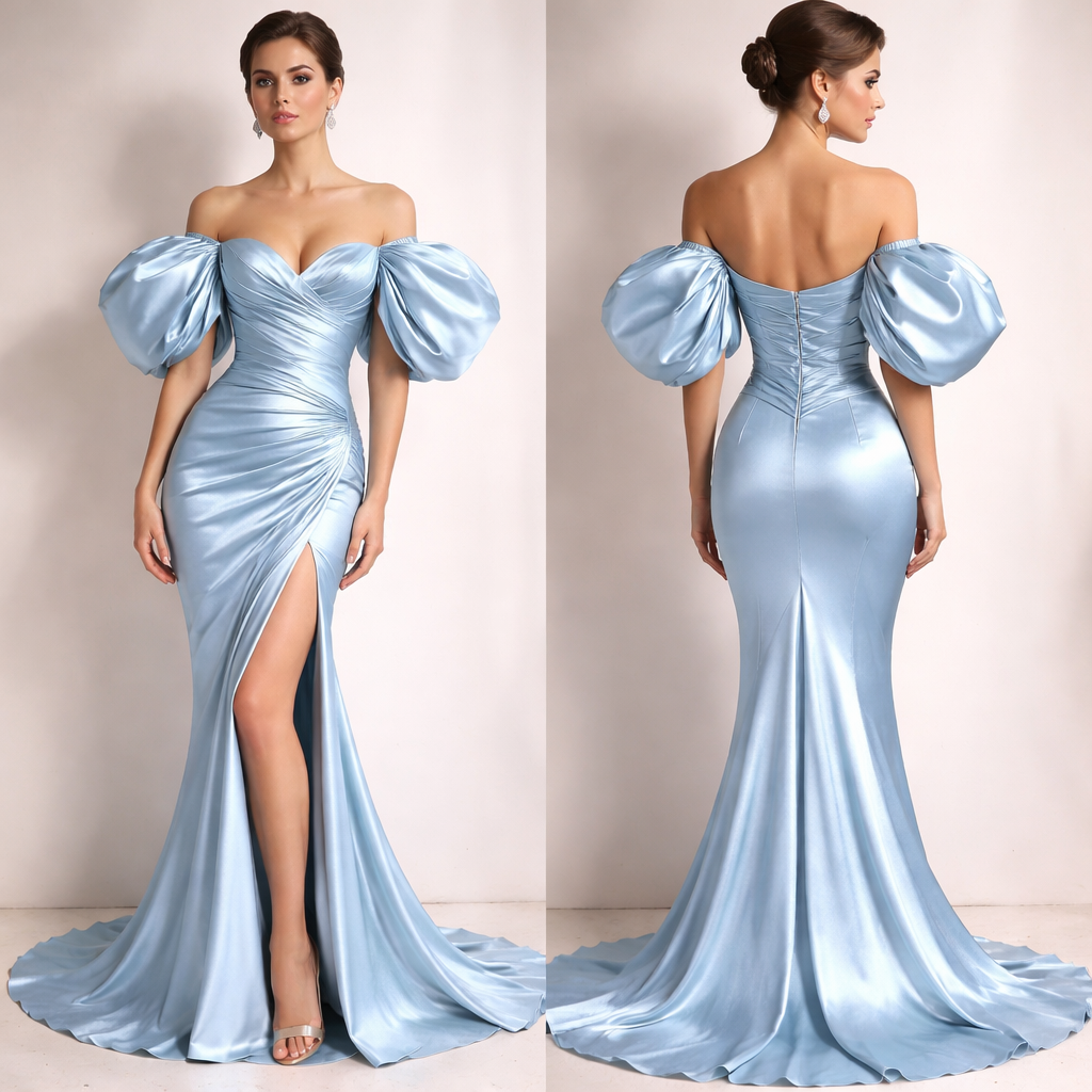 فستان شك والاكمام والكتاف ستان كبير لون الازرق الفاتح افتح درجة