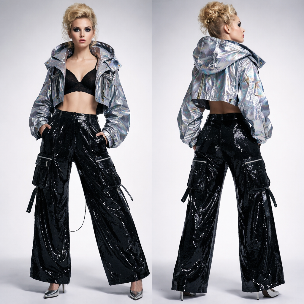 Arnold Scaasi evening pajamas 1966 , techwear style, show front and back