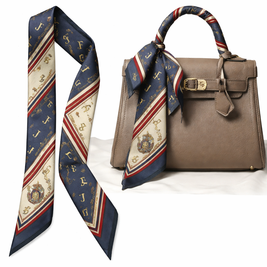 Silk scarf that is 5x86cm designed for a handle on a Kelly style bag using the initials in JF in a diagonal pattern. Intended for a signature look for Jolie Franc. Give it an american classic look with British heritage flair, classic style