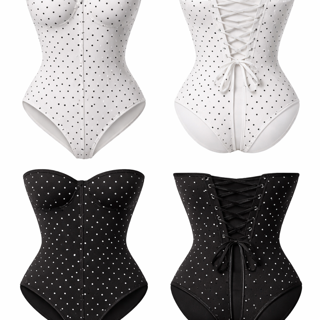 Shape wear no ai model all cotton seamless g string white and black pocker dots strapless corset no built in bra just corset in bodysuit no undies other way around black and white tie at the back pocker dots no bow tie at the back not front , classic style, show front and back