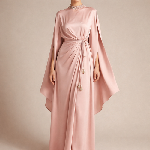 Modest blush pink silk crepe kaftan, floor length, high neckline, unique asymmetric draped cutline from shoulder to wais...