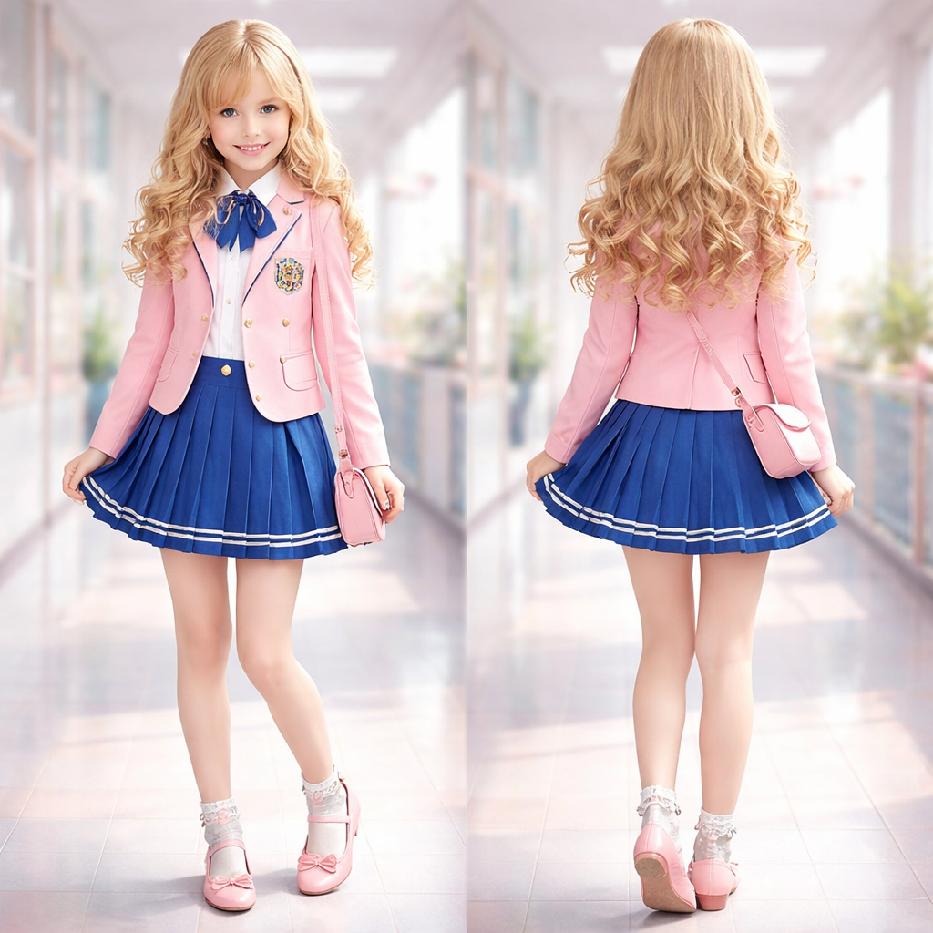 A European girl with blond curled hair wears a pink blazer and a cobalt blue skirt and she has pink ballerina shoes , school_uniform style, show front and back