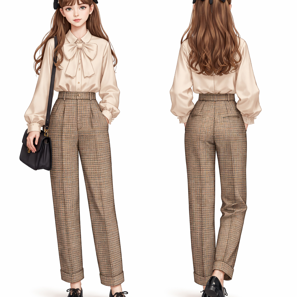 A 16 year old Girl with European Face has brown hair in a bow wears beige blouse with houndstooth pants in beige and black and black Oxford shoes , light_academia style, show front and back