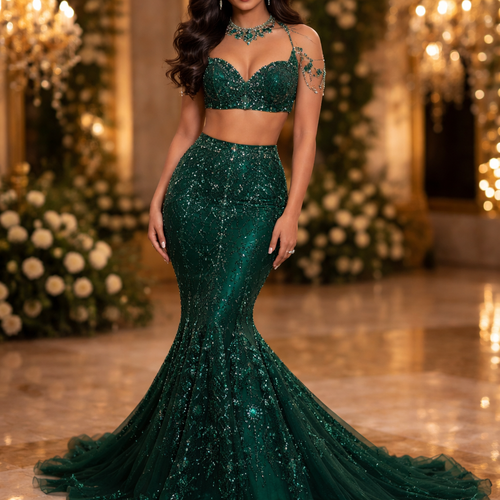 make a high waisted lehenga with a short blouse, sweetheart neckline with beads. the colour is emerald green with a merm...