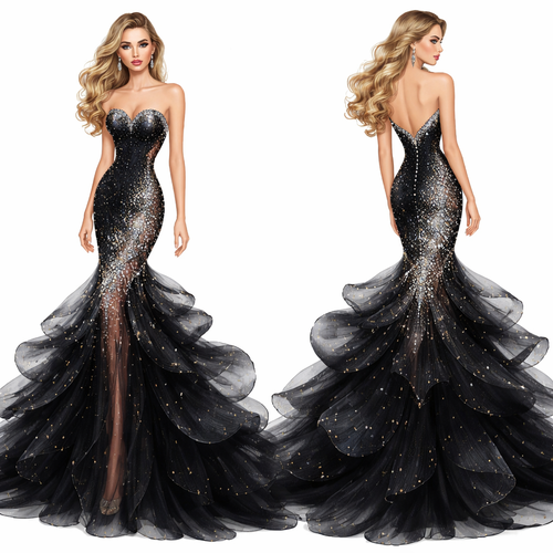 black straight line of strapless with a lot of bling fading down into the dress that then forms into a flower like flowy...