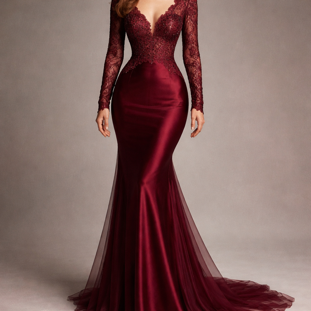 Haljina je duga i elegantna, izrađena u dubokoj tamnocrvenoj (bordo) nijansi s kombinacijom satenskog i čipkastog materijala. Gornji dio haljine je potpuno pripijen uz tijelo i izrađen od prozirnog čipkastog materijala s bogatim, gustim cvjetnim uzorkom koji se proteže preko cijelog torza i dugih rukava. Ispod čipke vidi se podloga u istoj crvenoj boji, što daje sofisticiran i luksuzan dojam. Izrez je u obliku slova V, srednje dubine, obrubljen čipkom koja se simetrično spušta prema struku. Struk je naglašen i lagano stegnut, s vidljivim prijelazom iz čipke u glatki, sjajni satenski materijal koji čini donji dio haljine. Donji dio pada ravno niz tijelo i ima mekan, tečan pad, a ispod satena se nazire lagani prozirni sloj koji haljini daje dodatnu dubinu i eleganciju pri hodu. Haljina u cjelini djeluje vrlo svečano i profinjeno, naglašava siluetu, a kombinacija čipke i satena, zajedno s bogatom bordo bojom, čini je izrazito prepoznatljivom i upečatljivom, idealnom za maturalne večeri, gala događaje ili formalne proslave.