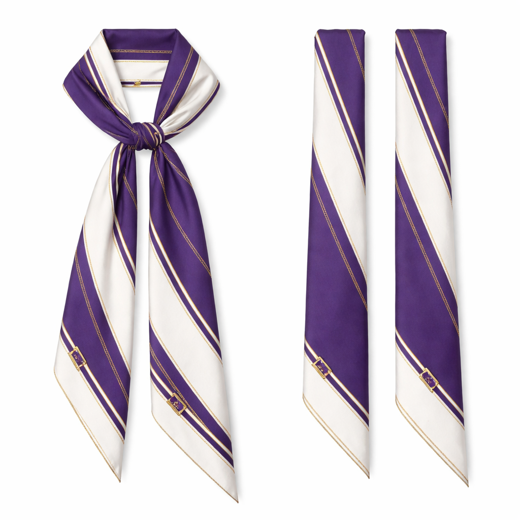 Design a silk twilly scarf that is 5x86cm. It needs to be tailored and simple with the colors royal purple and white, classic style, show front and back
