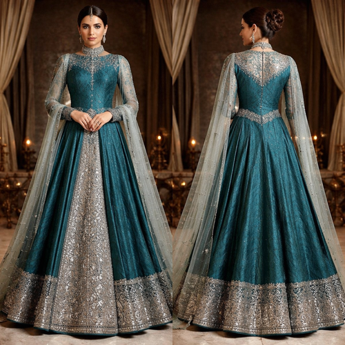 Regal A-Line Lehenga with Structured Long Blouse + Sheer Dupatta Fabric: Banarasi silk saree (dark turquoise color with ...