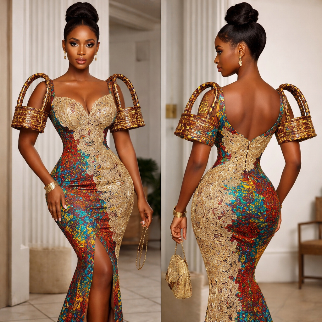 I to create an evening dinner dress that unique and elegant that is made from African lace fabric and mixed with beautif...