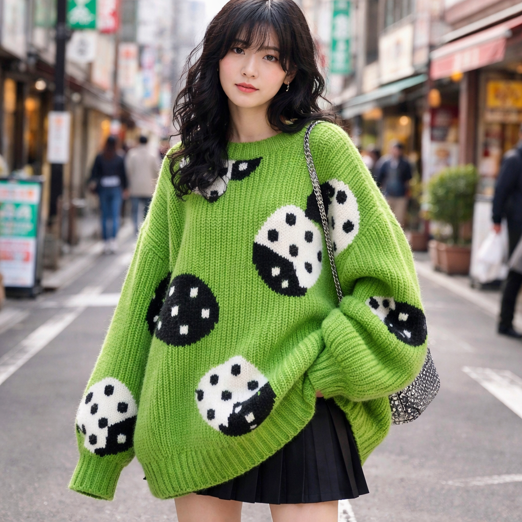 Japanese Street fashion design: **A slouchy, oversized bright green chunky knit sweater with large black and white dice patterns, worn with a relaxed fit.**