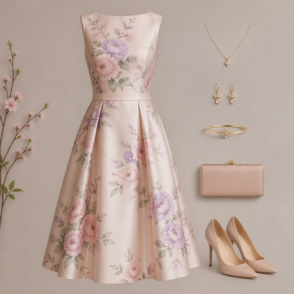 photorealistic fashion design, Vestido elegante de primavera corte midi, tela de seda floral , color pastel, incluye accesorios collar fino de oro, aretes a juego, pulsera delicada , cartera de mano tipo clutch y zapatos de tacón , formal style, just the design no text