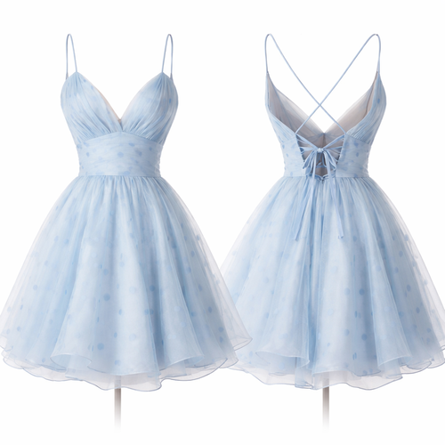 Short feminine soft luxury dress in baby blue fabric with subtle darker blue polka dots. The dress features thin delicat...