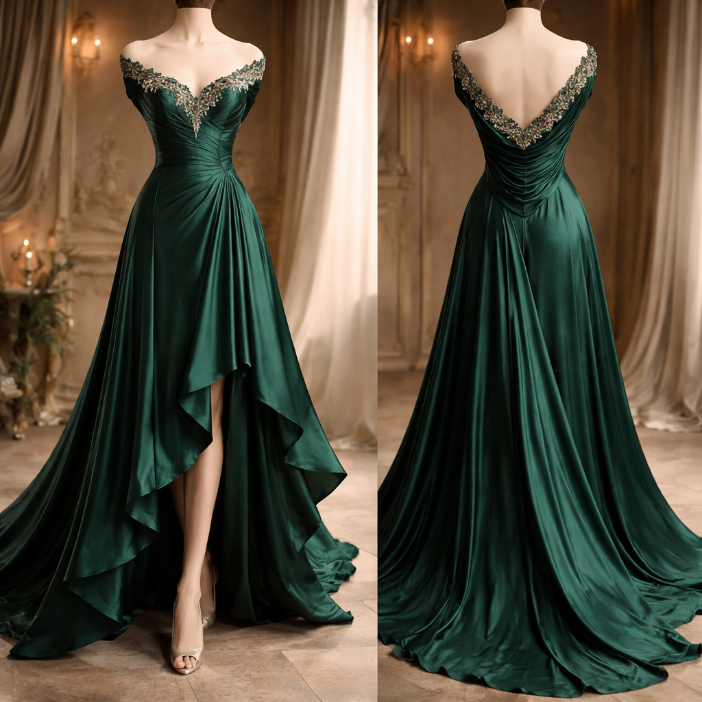 Flowing silk evening gown with asymmetric hemline, botanical embroidery along the neckline, in deep emerald green , vintage style, show front and back