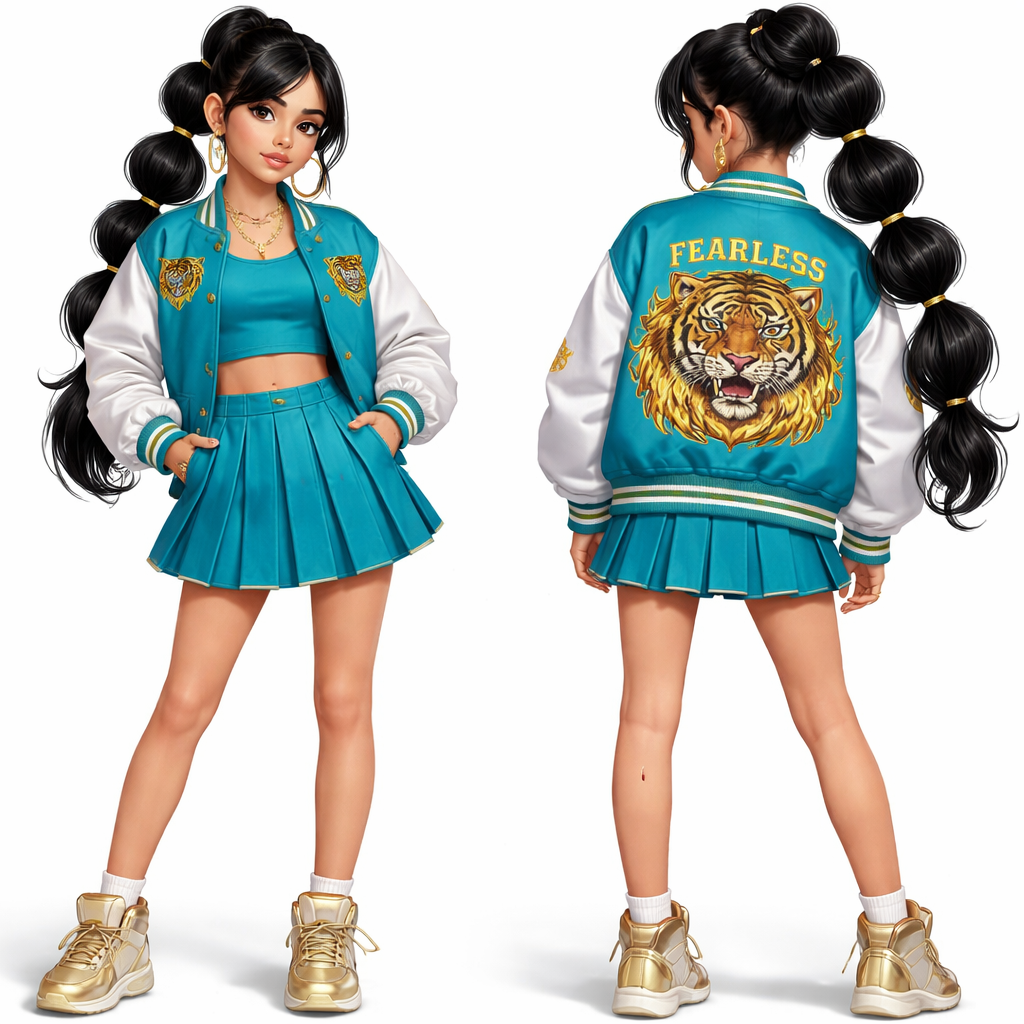 A 16 year old teenage girl with a Middle East face and black hair in bubble ponytail with gold hair ties wears turquoise top and a jacket with a tiger on it and turquoise skirt and gold sneakers , varsity style, show front and back