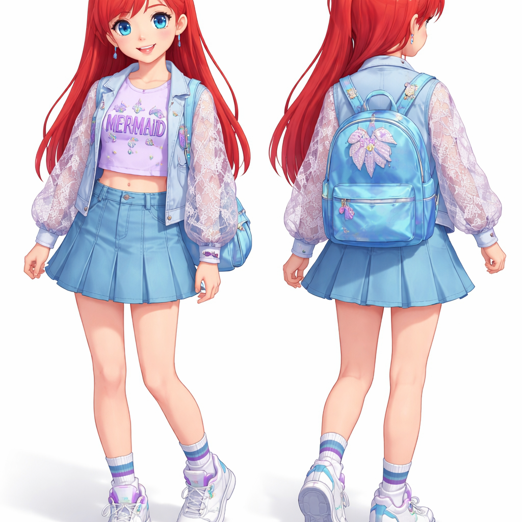 A Disney princess arille 12 year old girl with a school look a girl with red straight hair and short of side bangs a purple shirt with puffy sleeves and the shirt says mermaid and a blue short skirt and a blue lace jacket with a mermaid tail on the back and a blue backpack , streetwear style, show front and back
