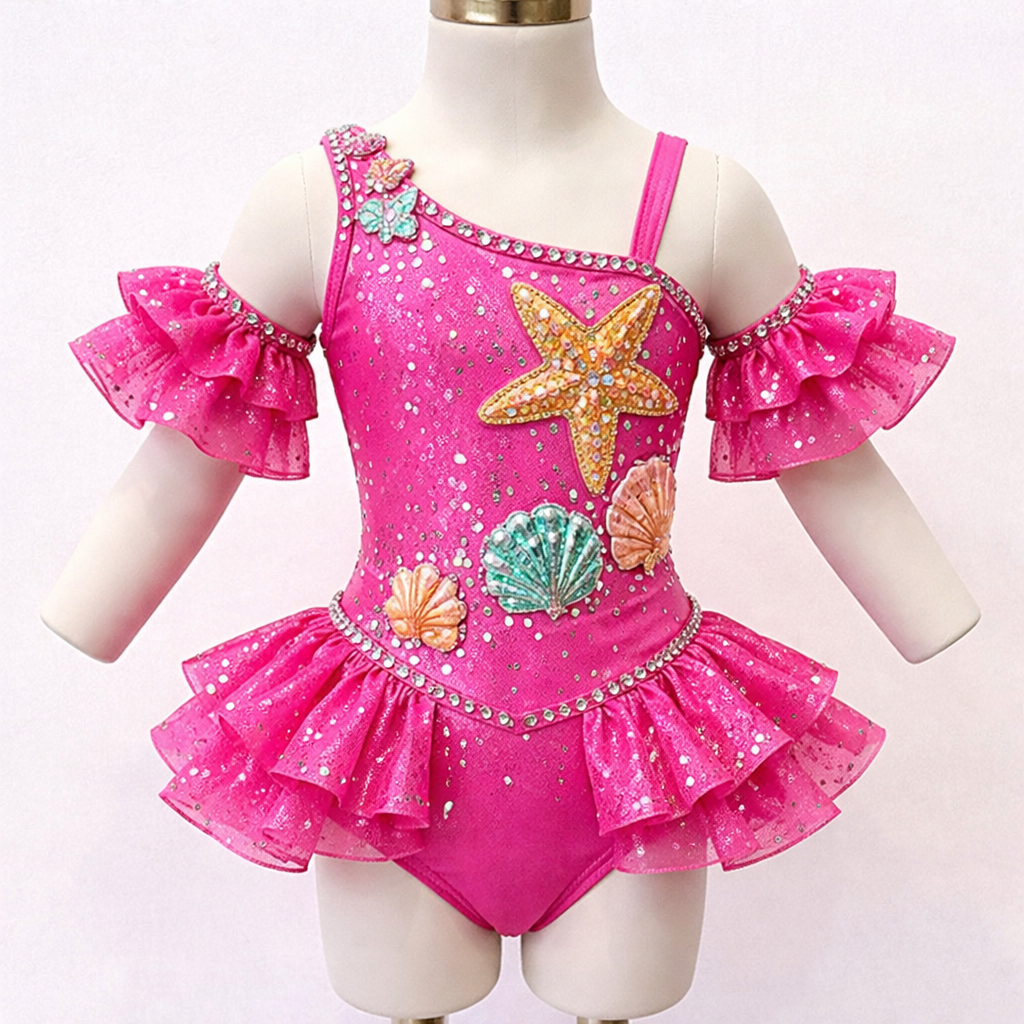 Beach party theme one piece kids dance costume in hot pink shimmer Lycra with starfish and shell appliqué and rhinestone detailing and sequins with short Lycra ruffle skirt plus riffle arm band
