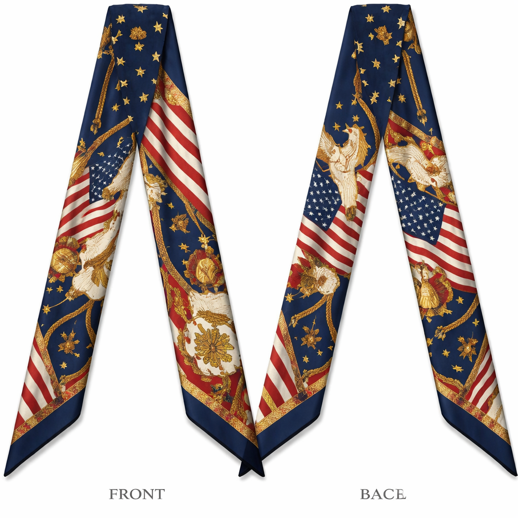 Design a silk twilly scarf that is 5x 86cm that is for the United States of America’s 250th birthday. No words or logos. Ralph Lauren vibe. , classic style, show front and back