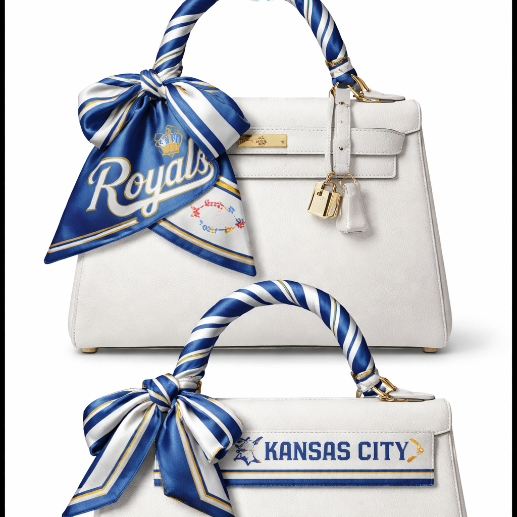 Create a silk card that is wrapped on a Kelly bag top handle that is for the KC Royals that uses their colors using classic stripe that is a nod to their uniform for baseball.