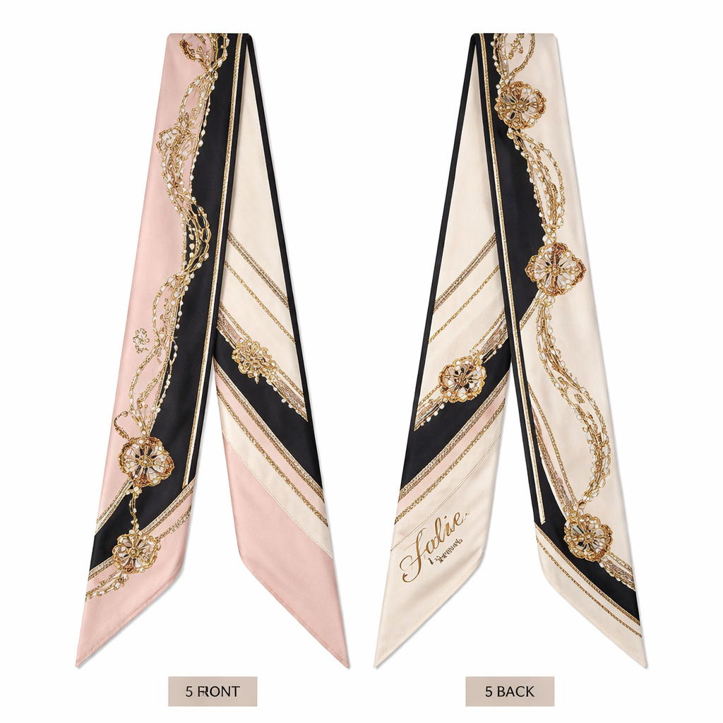 Design a silk scarf that is 5 x 86cm that wraps around a handle of a handbag Jolie Franc targets style-conscious consumers seeking elevated, design-driven products that balance sophistication with wearability. Our core customer prioritizes quality, aesthetic cohesion, and emotional connection to brand—positioning Jolie Franc at the intersection of modern luxury and everyday elegance., classic style, show front and back
