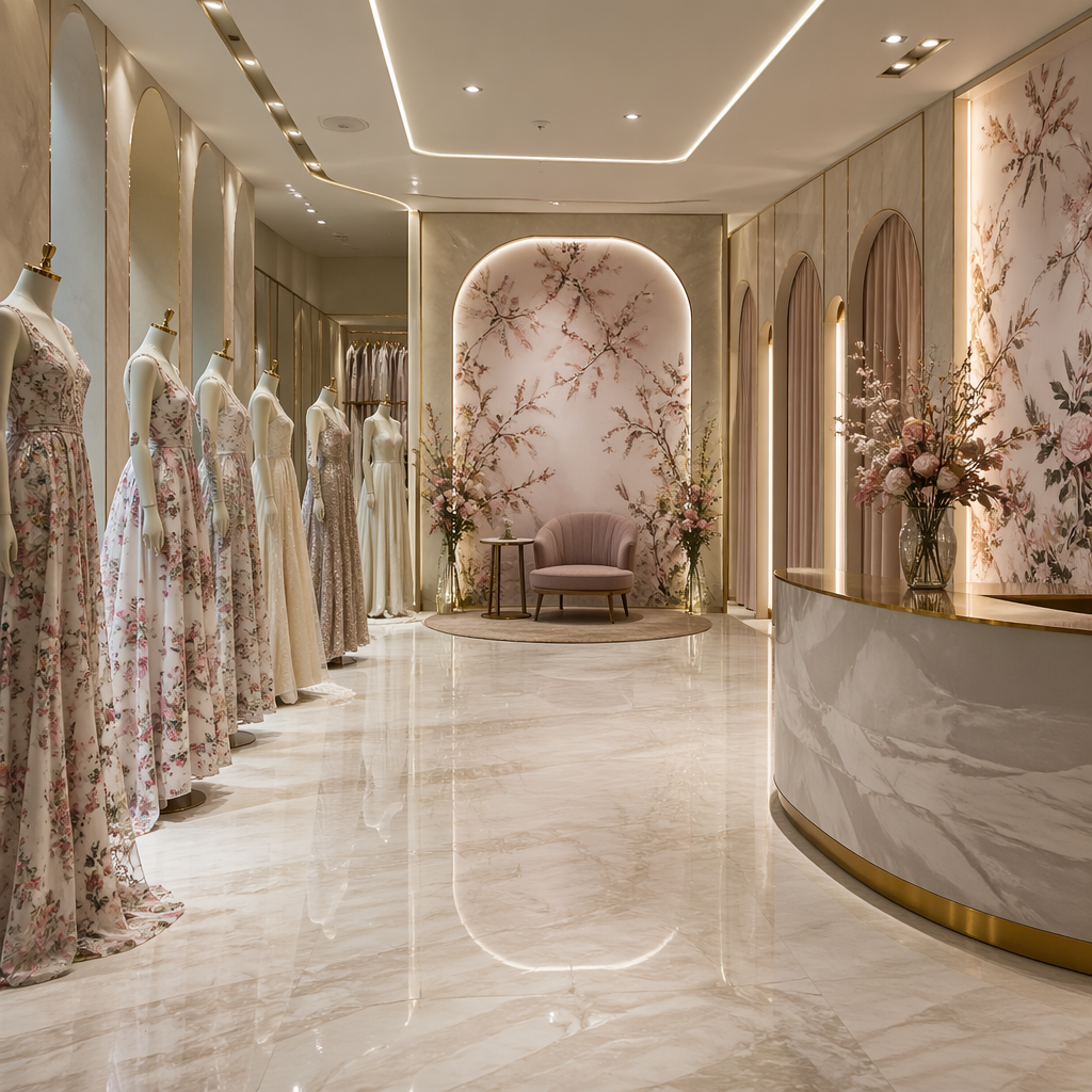 Standing gowns style not folding Floral chic design Waiting area Photo section Fitting room Counter. UAE fashion aesthet...