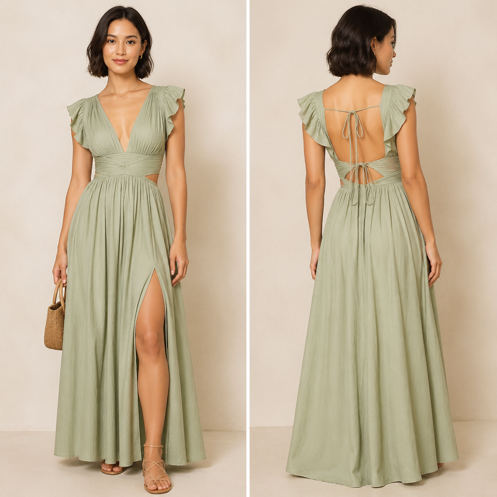photorealistic fashion design, Create a summer look for a petite size women in mid 30s using current trends, silhouette and color, flowy dress, summer style, just the design no text, show front and back