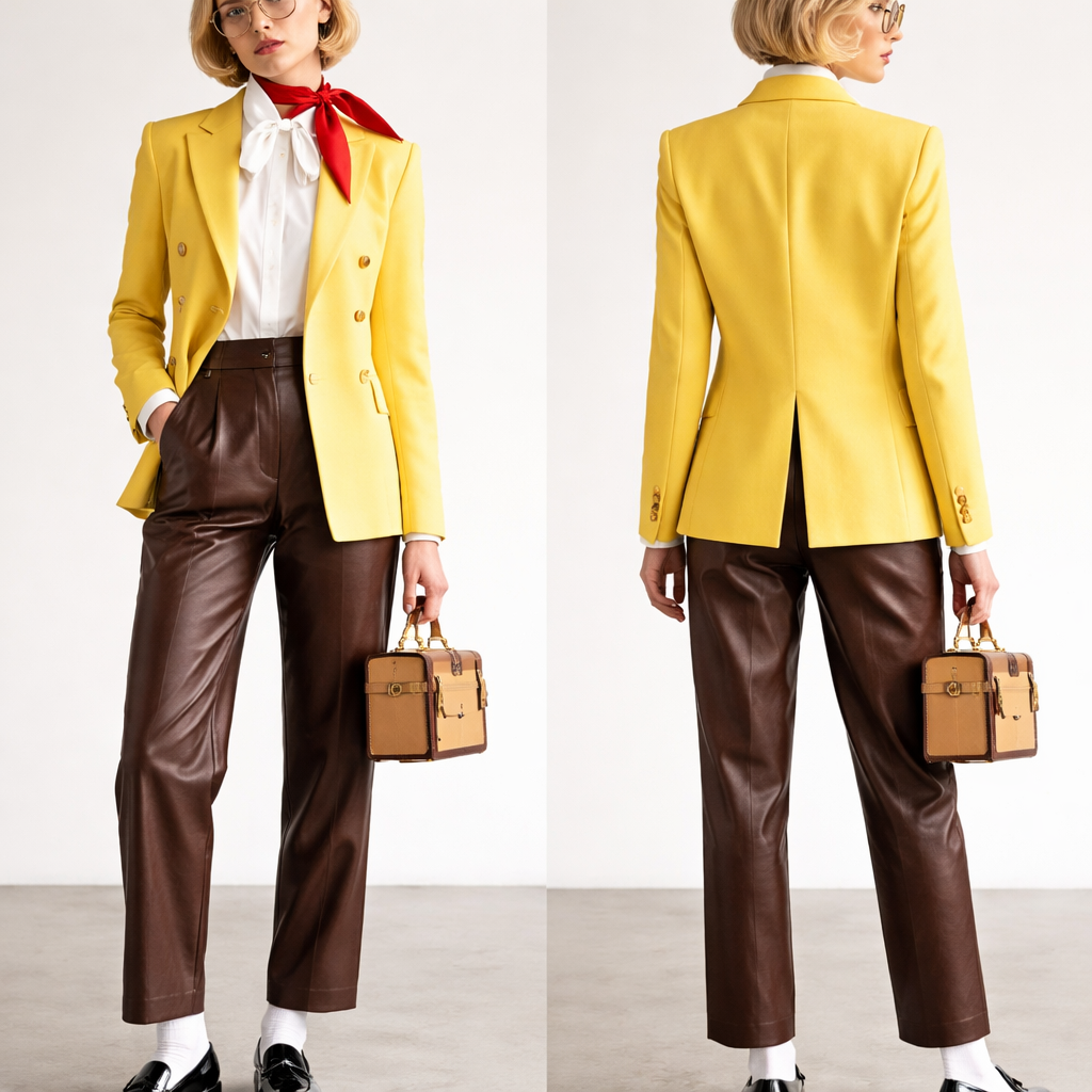 Start with a structured, canary yellow double-breasted blazer worn over a crisp white pussy-bow blouse to mimic his shirt and collar. For the "pants," opt for high-waisted chocolate brown leather trousers with a straight-leg cut to give it a modern, edgy texture. To nod to his signature tie, add a skinny silk scarf in a bold poppy red, tied chicly at the side of the neck. Ground the look with black patent leather loafers and white crew socks that hit just above the ankle. Complete the vibe with a miniature square trunk bag in a sandy tan and gold-rimmed glasses for a look that is whimsical, impeccably tailored, and unmistakably "Bikini Bottom" chic., show front and back