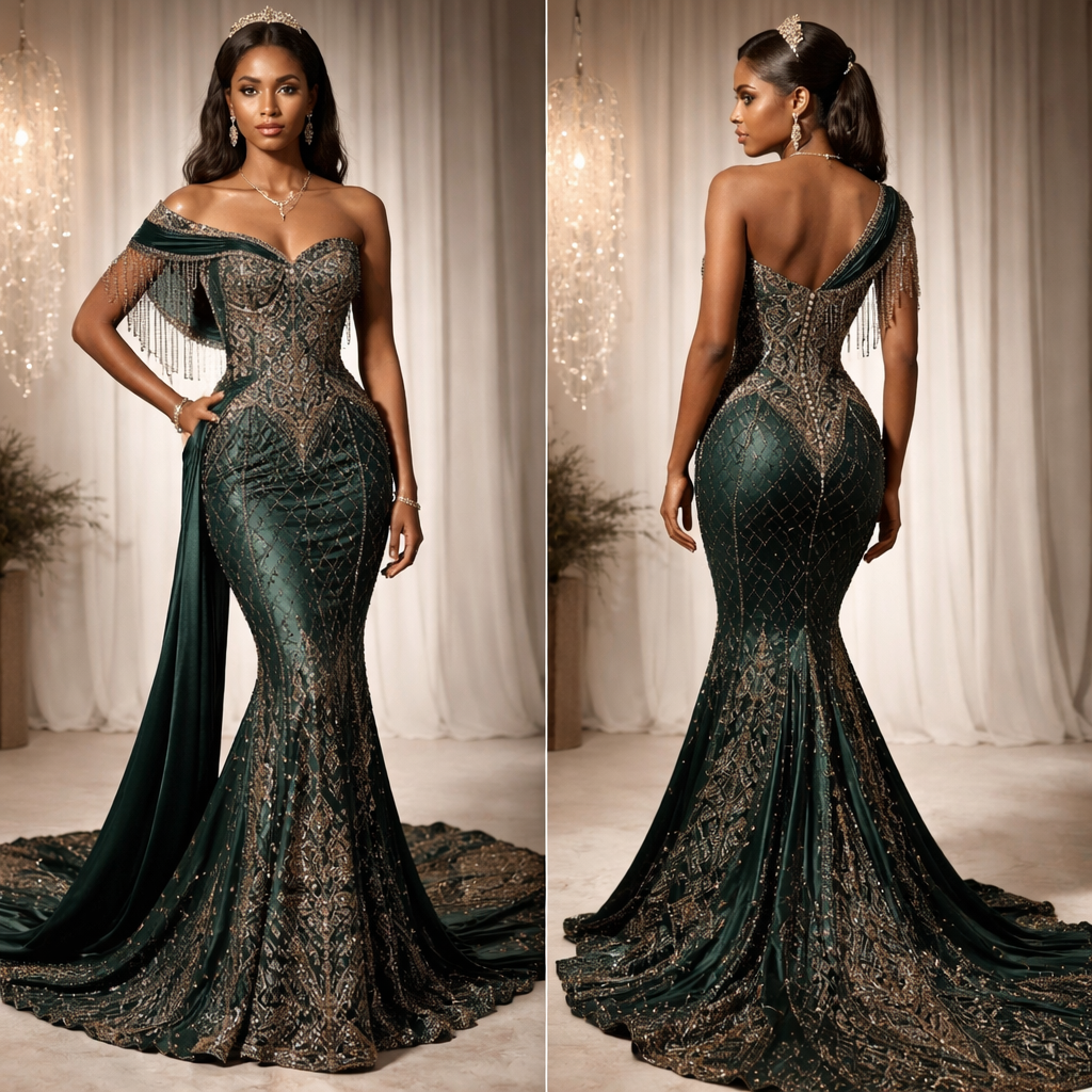 “Generate a luxurious Somali-inspired bridal evening gown with a fitted mermaid silhouette, modest but figure-flattering, made from dark emerald green patterned fabric with elegant geometric traditional motifs. The dress should have a structured embellished corset bodice, draped off-shoulder detail, one-shoulder elegant styling, beaded fringe on the sleeve, and a long dramatic train. Add rich sparkling embellishments, a high-fashion couture look, soft glamorous styling, and a regal feminine aesthetic.”, elegant style, show front and back