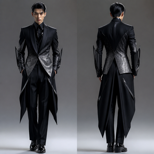 A Male fashion design, in Japanese Street style. Un traje de noche elegante agresivo y futurista en negro y plateado. VE...