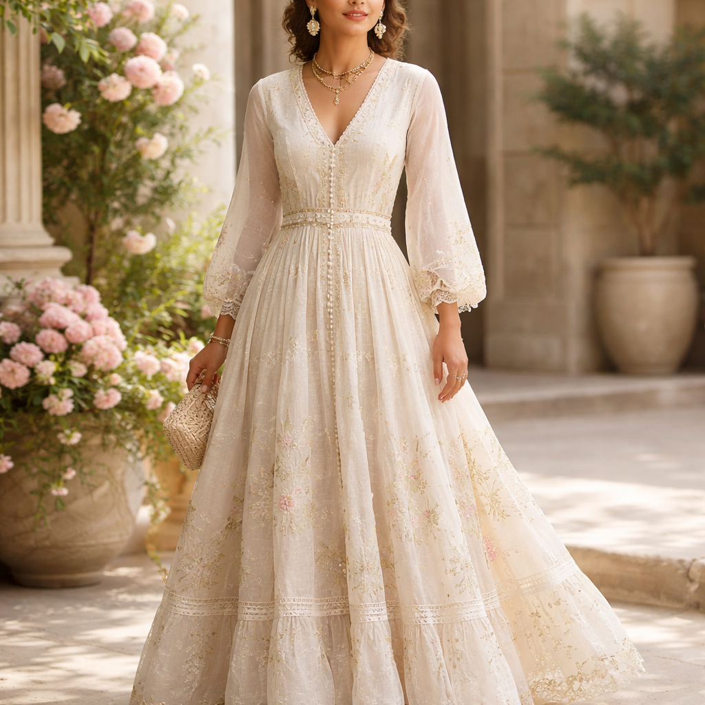 A Female Dress design, suitable for Spring, in Quiet Luxury style. India fashion aesthetics.