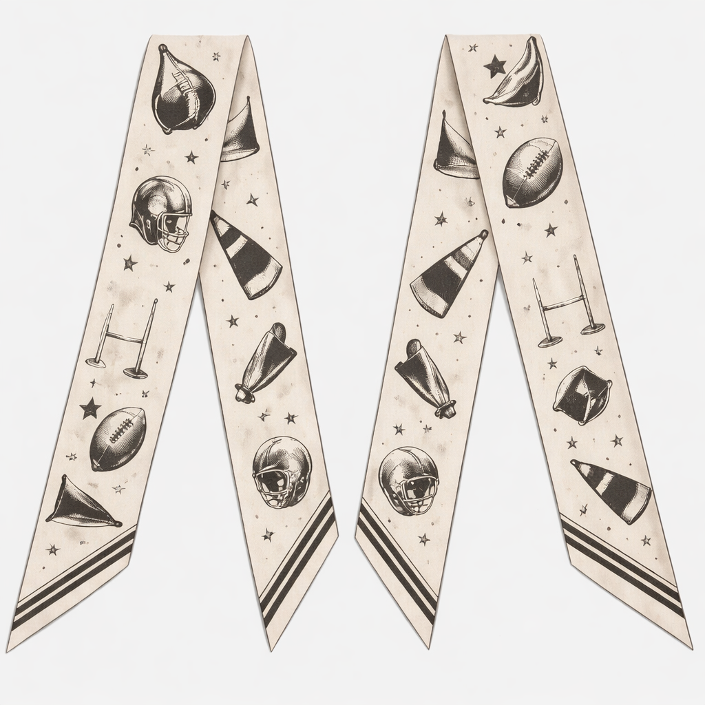 Design a silk scarf that is 5 x 86 cm with oblique edges. It will be wrapped around a handle of a handbag. That has a football vibe. No colors. Keep it vintage. No words or logos. All American and a lot more simple. Even more plain. Ralph Lauren looking. Make it feminine
