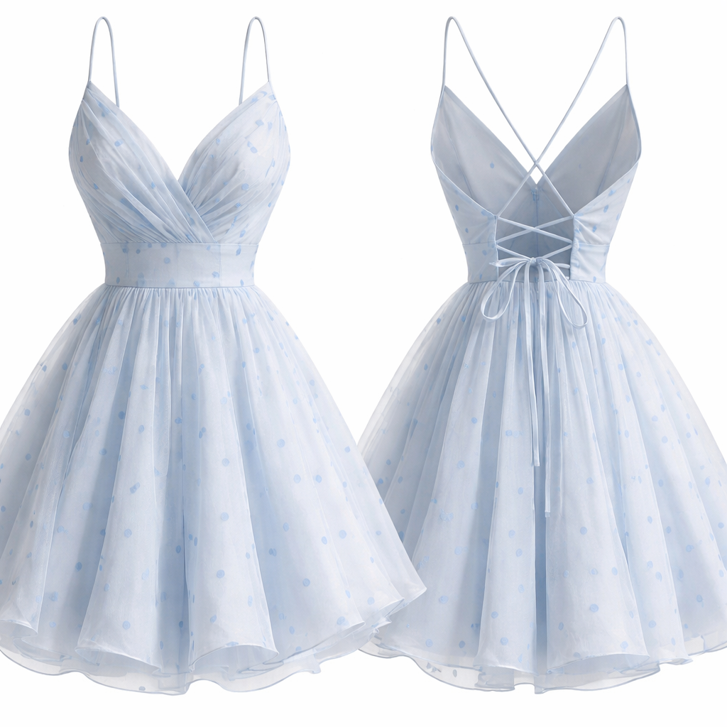 Short feminine soft luxury dress in baby blue fabric with subtle darker blue polka dots. The dress features thin delicate spaghetti straps and a deep V neckline with soft gathered detailing at the bust. The waist is slightly defined to enhance the silhouette, flowing into a voluminous, airy skirt made from lightweight layered organza. The hemline is structured with a soft rounded finish to add movement and elegance. The back is open with thin criss-cross straps and a tie detail, creating a delicate and feminine look. The overall design is minimal, elegant, and summery with a soft luxury aesthetic, summer style, show front and back