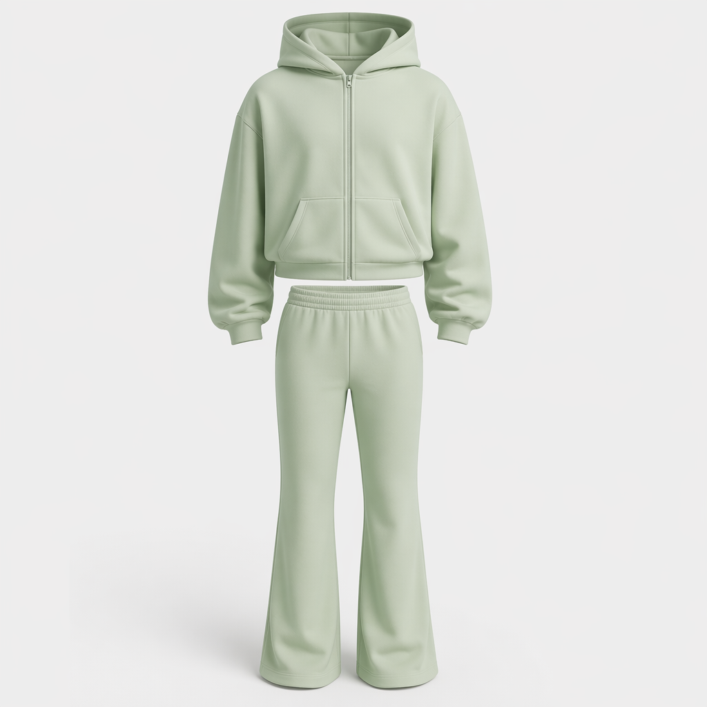 photorealistic fashion design, photorealistic fashion design, photorealistic fashion design, photorealistic fashion design, photorealistic fashion design, A Unisex Top design, in Casual style. Zip-up hoodie. Seamless, soft fabric, navy, everyday use, no tags.. Sweden fashion aesthetics., casual style, just the design no text. Refinement: Make it pastell green instead. , just the design no text. Refinement: Make pastell green boot cut sweatpants instead. , just the design no text. Refinement: Make them seamless, just the design no text. Refinement: extra soft waste , just the design no text