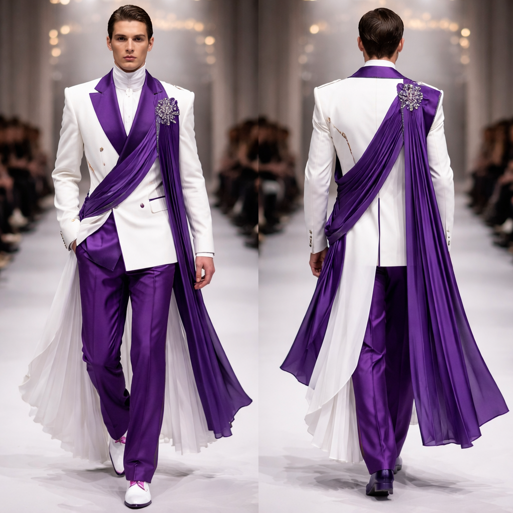 Men purple & white outfit in formal but in different for formal runway model , show front and back