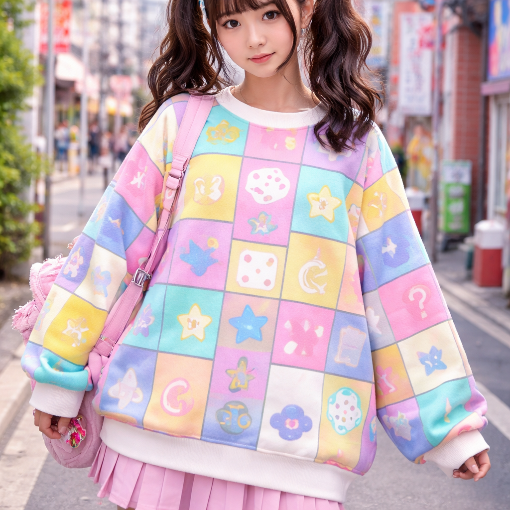 Japanese Street fashion design: Oversized cotton sweater, vibrant neon and pastel blocks, cute board game patterns, relaxed fit, playful Japanese streetwear.