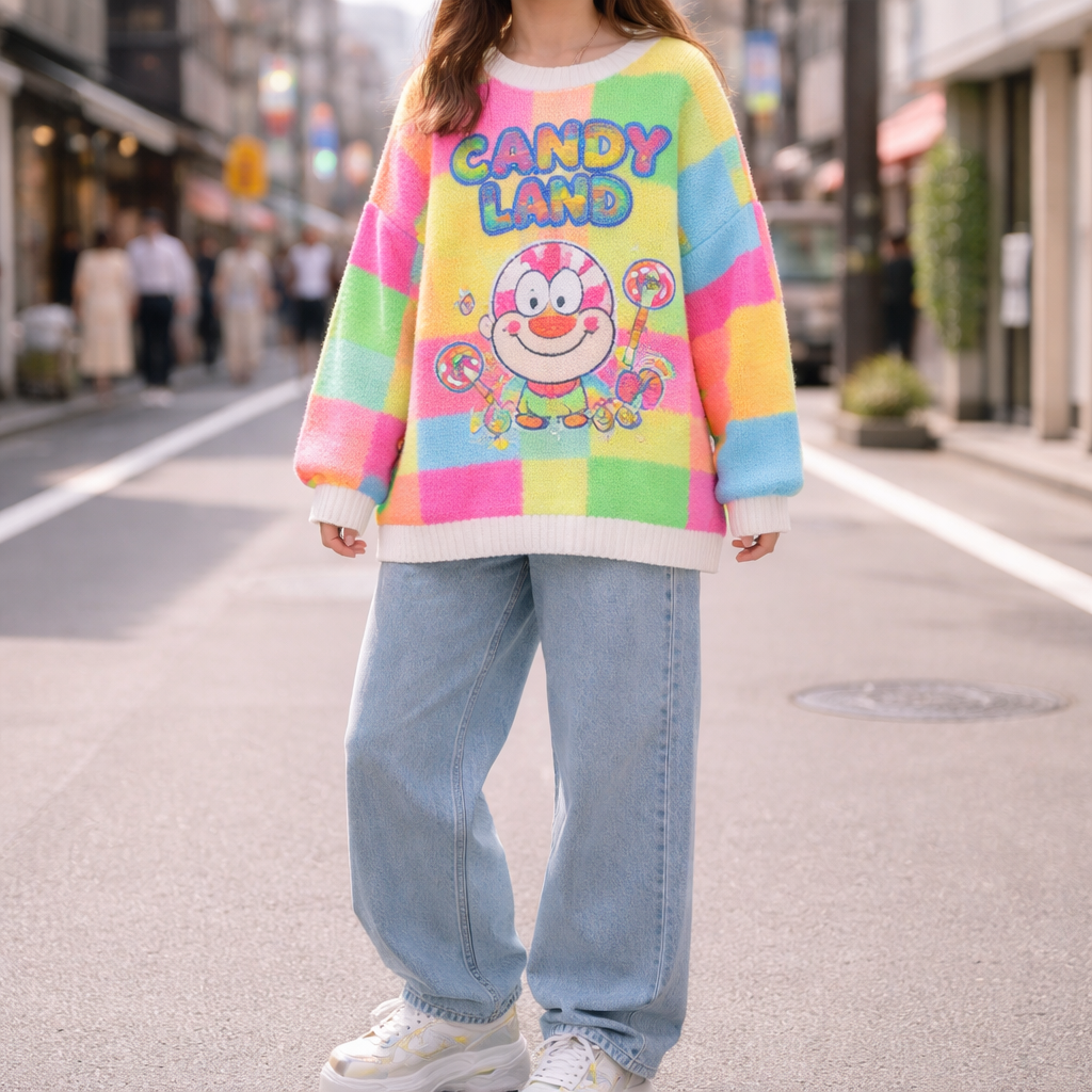 Japanese Street fashion design: **Loose-knit cotton sweater with a relaxed, slightly oversized fit. Neon pink, yellow, blue, and green blocks create a playful "Candy Land" board game pattern. Features a smiling cartoon candy character, long sleeves, and a simple crew neck. Paired with wide-leg light wash jeans and chunky platform sneakers.**