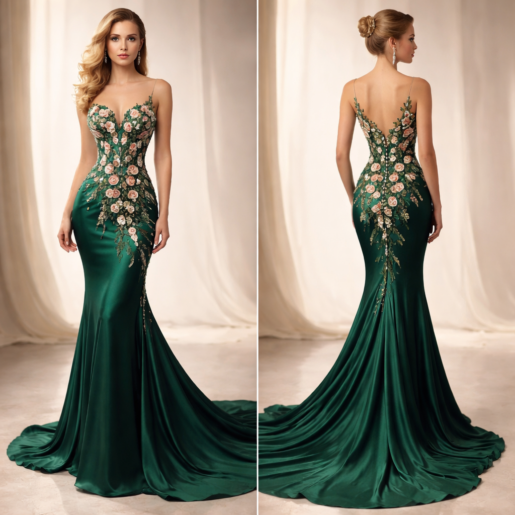 Silk green fabric, Many individual roses, stems and leaves, stand side by side from high to low in front of the chest. and the back mermaid shape, long dress, classic style, show front and back