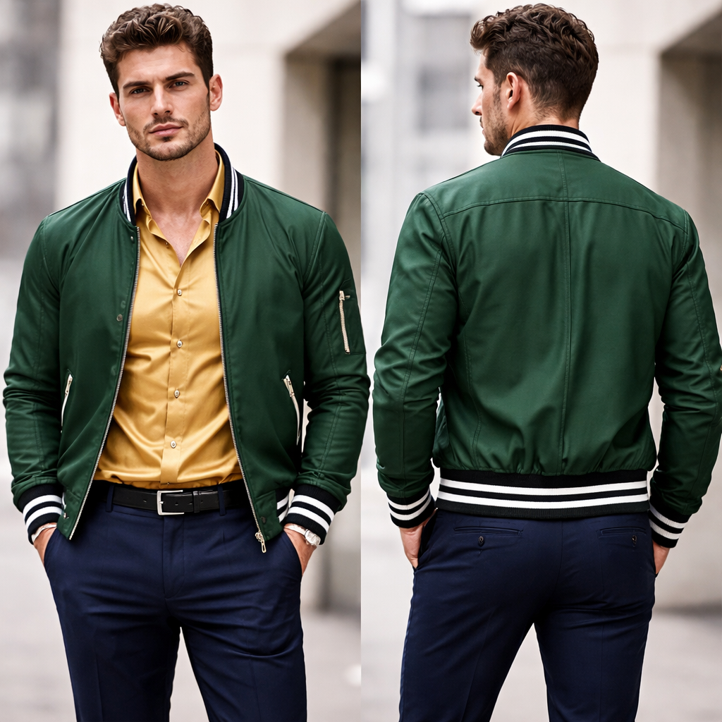 Green jacket, gold colored dress shirt, blue dress pants , sporty style, show front and back