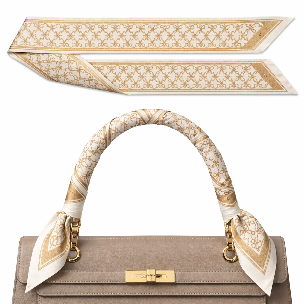 Design a silk scarf that is 5x 86cm to be a wrapped on a handle of a handbag. Interlocking JF monogram in a restrained lattice Motif scale is small and precise so it reads refined when wrapped