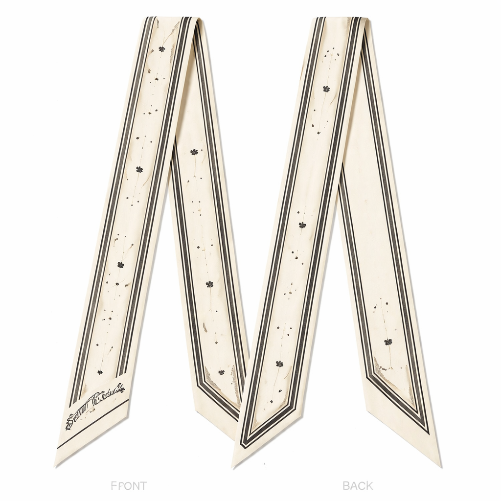 Luxury silk twilly for a handbag handle, 5 cm x 86 cm, long and narrow, soft cream base, elegant geometric or linear border in black with subtle antique gold accents, minimal abstract motifs or micro florals in the center, small refined “Jolie Franc” signature near one end, iconic, timeless, understated luxury, wearable, sophisticated, proportioned for wrapping around a handbag handle, patterns oriented along the length, elegant and high-end., show front and back
