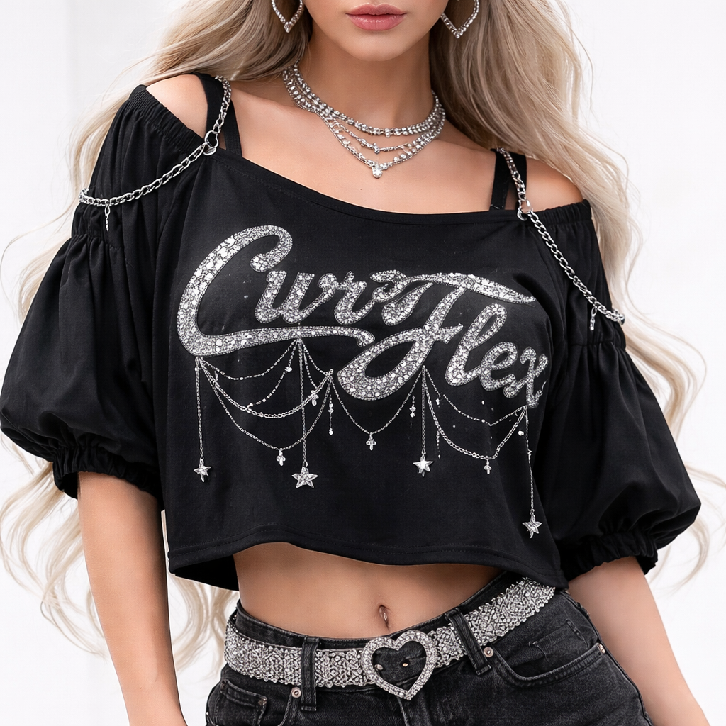 Baggy gum shirt with the name curve flex please make the design more feminine black shirt with silver detail