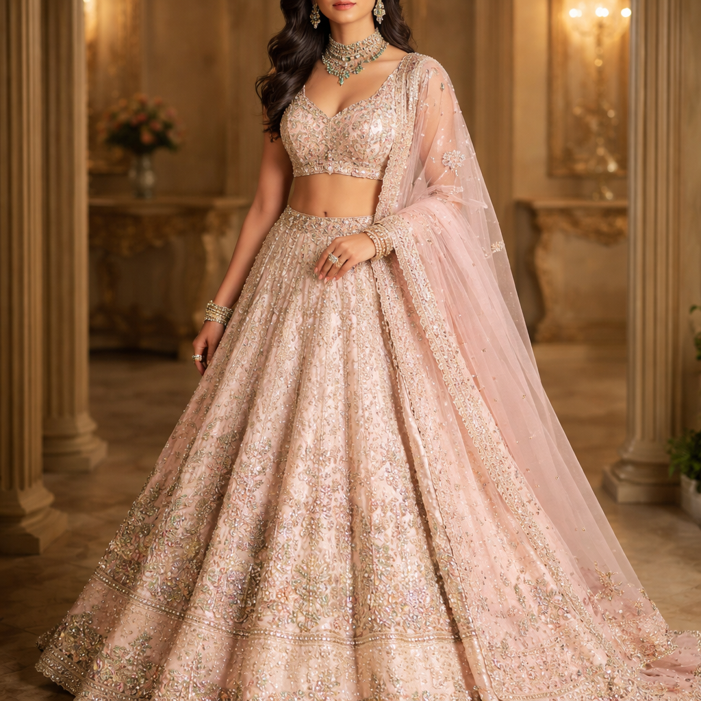 "Design a luxurious and feminine outfit, pastel colors, lace details, elegant silhouette"