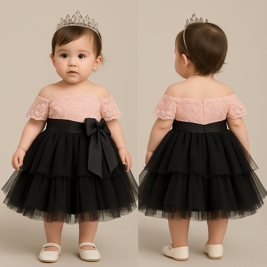 1歳の女の子のベビードレス着用画 黒のチュールドレス、膝丈のラッフルスカート(ボリューミー) 上半身はピンクで分厚いレースのオフショル、袖部分は肩に垂れる感じ、下のチュールに合う、大人っぽい素材 上の薄ピンクの部分に黒のサテン生地の太めのリボンを一周巻いて、真ん中ではなく、左前あたりで大きくリボン縛り 頭には派手すぎないシルバーのティアラ, show front and back