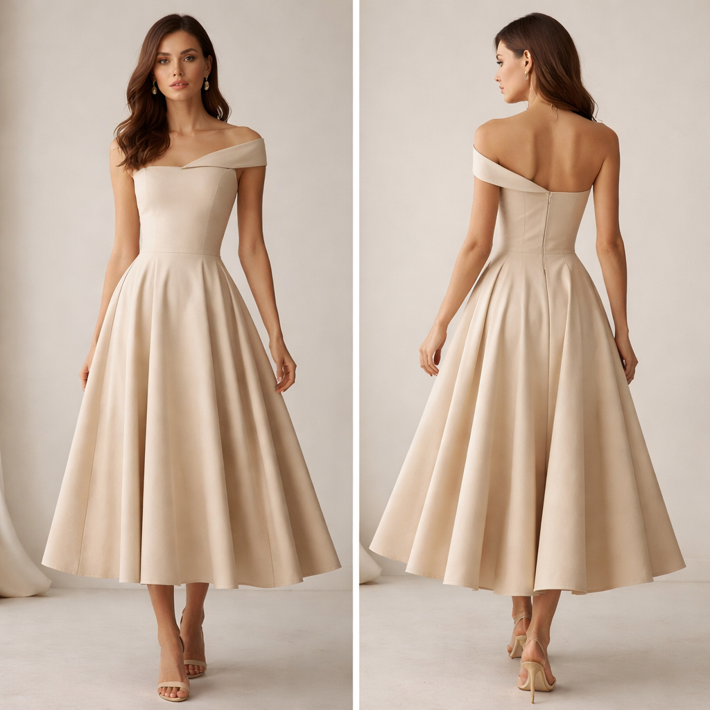 Elegant women’s dress in beige. The top features a single off-shoulder design, fitted to the body, with a subtle, chic neckline. The skirt is a flowing A-line midi skirt with soft pleats, creating movement and volume. The dress is minimalistic, fabric is cotton & linen mix. Focus on clean lines, high-end finish, and a flattering silhouette., elegant style, show front and back