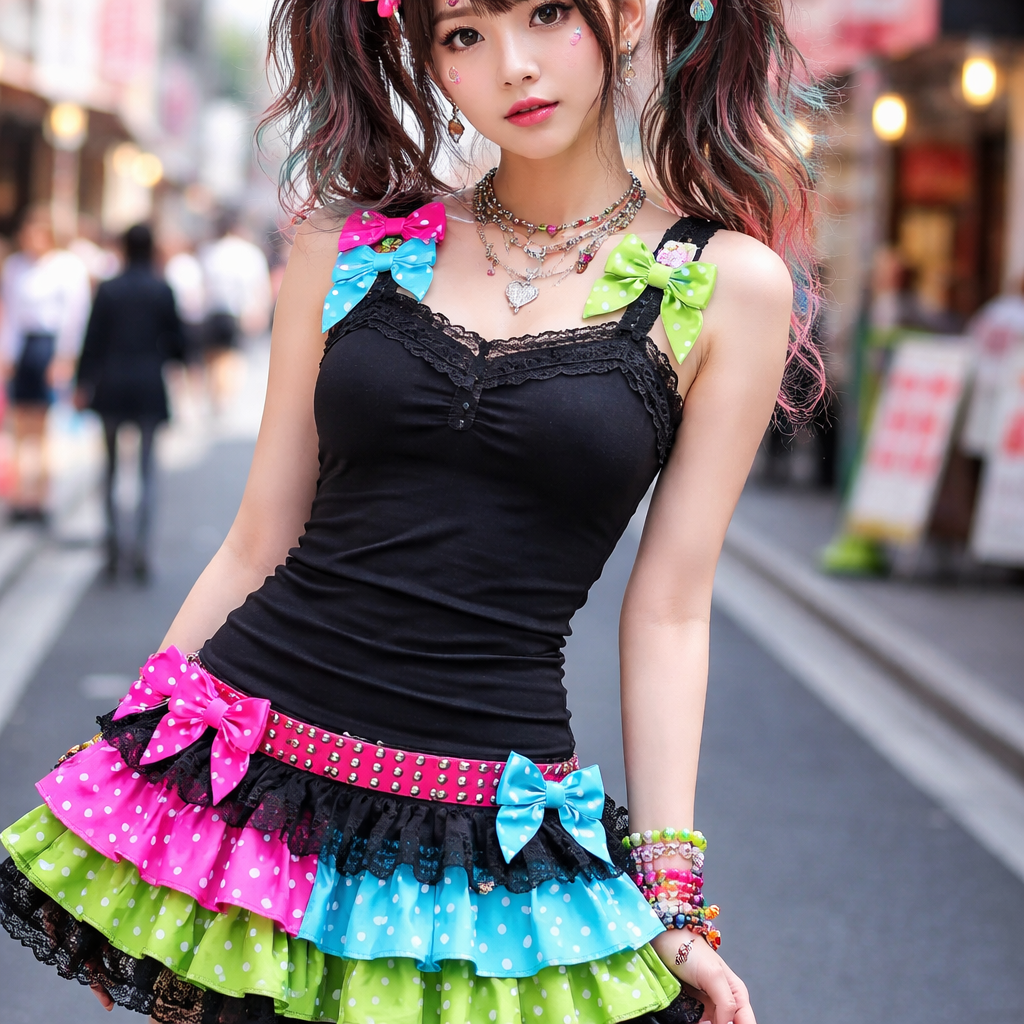 Japanese Street fashion design: Black form-fitting tank, lace ruffles. Layers: hot pink, aqua, and bright green polka dots. Little edgy. Pink, aqua, green bows on straps. Japanese street style: playful, slightly mismatched, bold color accents.