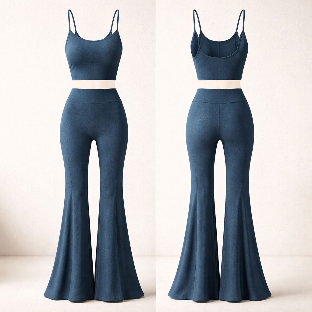 create for me a cotton or linen earth colored jumsuit with wide flares on the bottom and a tight top that has inside bra to support brest its multifunctional natural and eco friendly jumpsuit to do yoga but also dress casually during the day elegant and graceful and sexy pls make the top simple with no tightening features around breast just simple and minimalistic yet sexy can u remove the line by the belly and make it just smooth all the way as one piece? now create this piece but just pants same style color and fabric the top needs to be a comfortable tob effortless and graceful do one set in dark ocean blue , show front and back