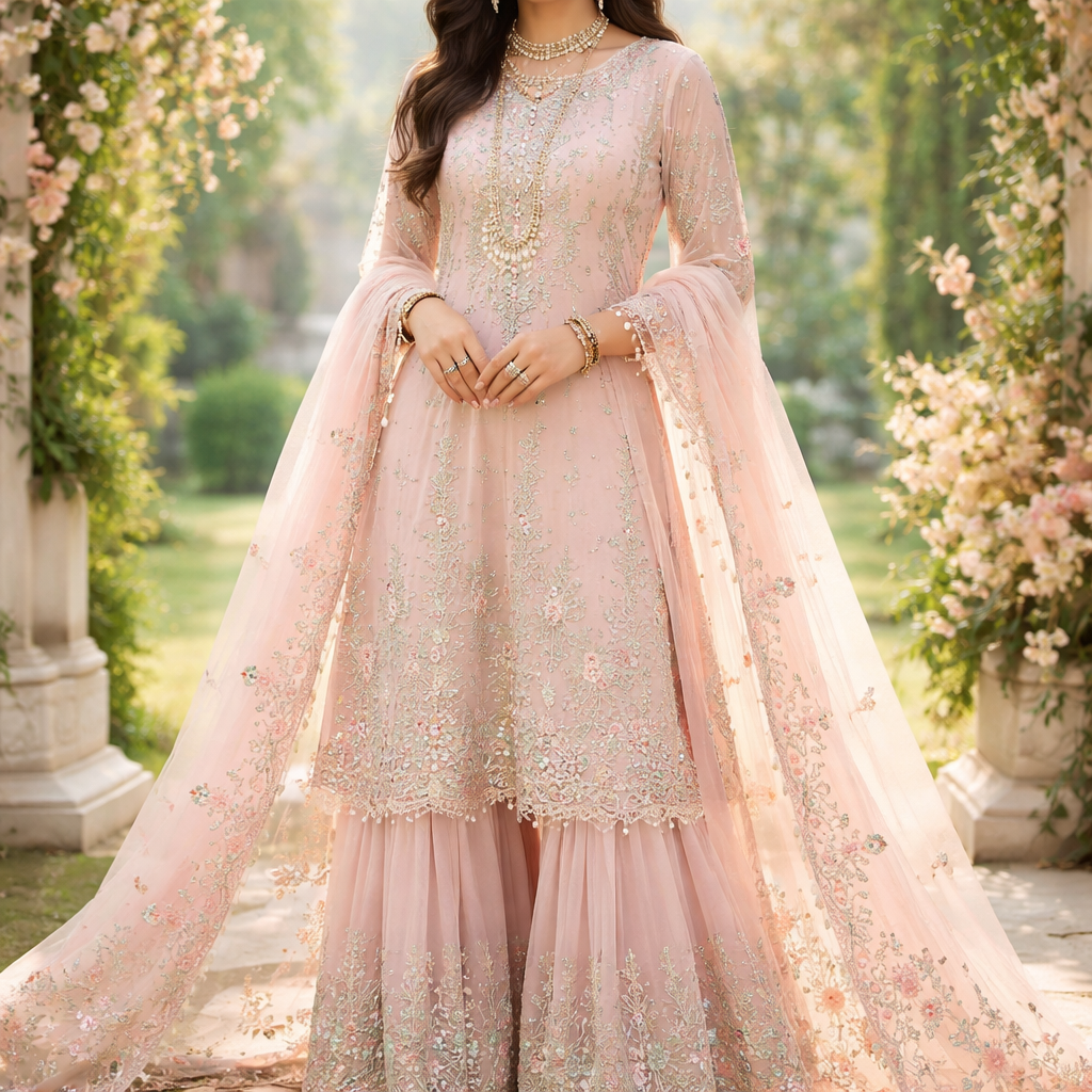 A Dress design. Consider Pakistani fashion — shalwar kameez, gharara, sharara; lawn fabrics, chiffon; intricate embroide...