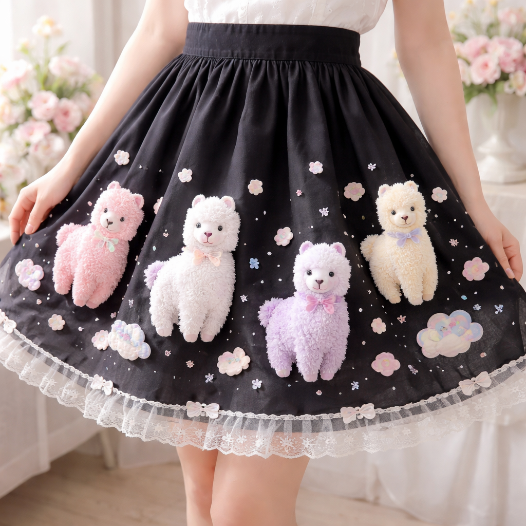 Romantic fashion design: Just above the knee length, black cotton skirt with cute pastel cartoon fluffy 3D textured alpacas. Flowing, A-line silhouette, soft gathers, and delicate lace trim.